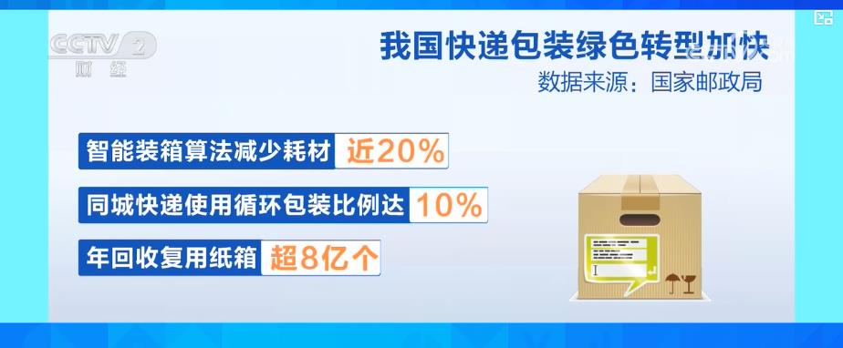 “十四五”期间,我国快递包装新技术、回收循环复用新场景不断涌现。“瘦身”胶带、“瘦脸”运单等减量化包装得到广泛应用。全行业电子运单、循环中转袋基本实现全覆盖,包装标准化率达86%,包装箱层数、包装袋厚度减量过半,胶带宽度减量25%,智能装箱算法减少耗材近20%,同城快递使用循环包装比例达10%,年回收复用纸箱超8亿个。